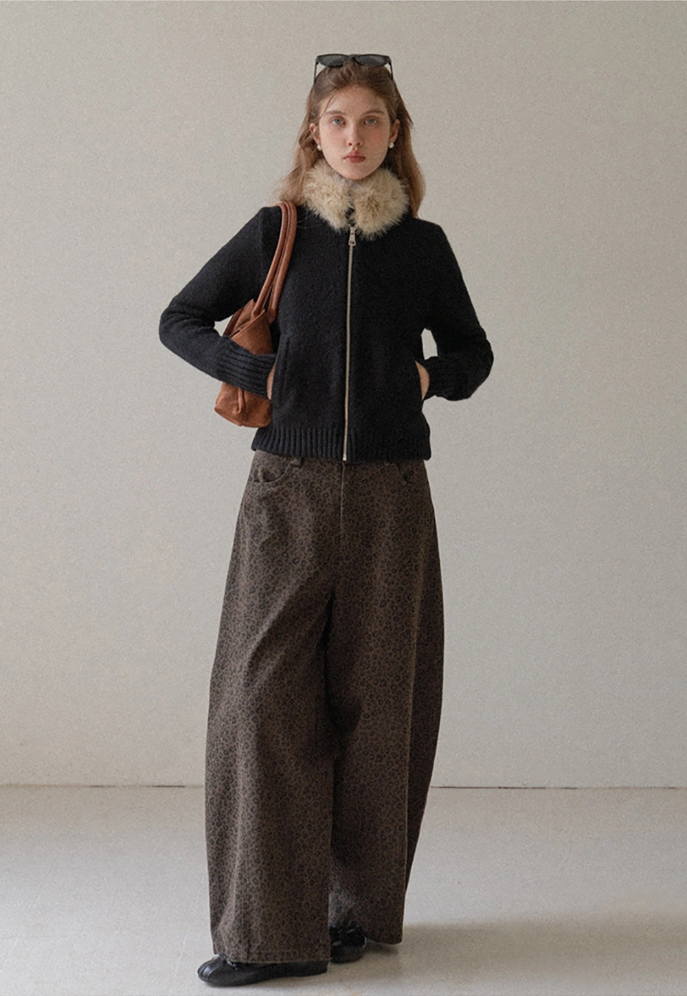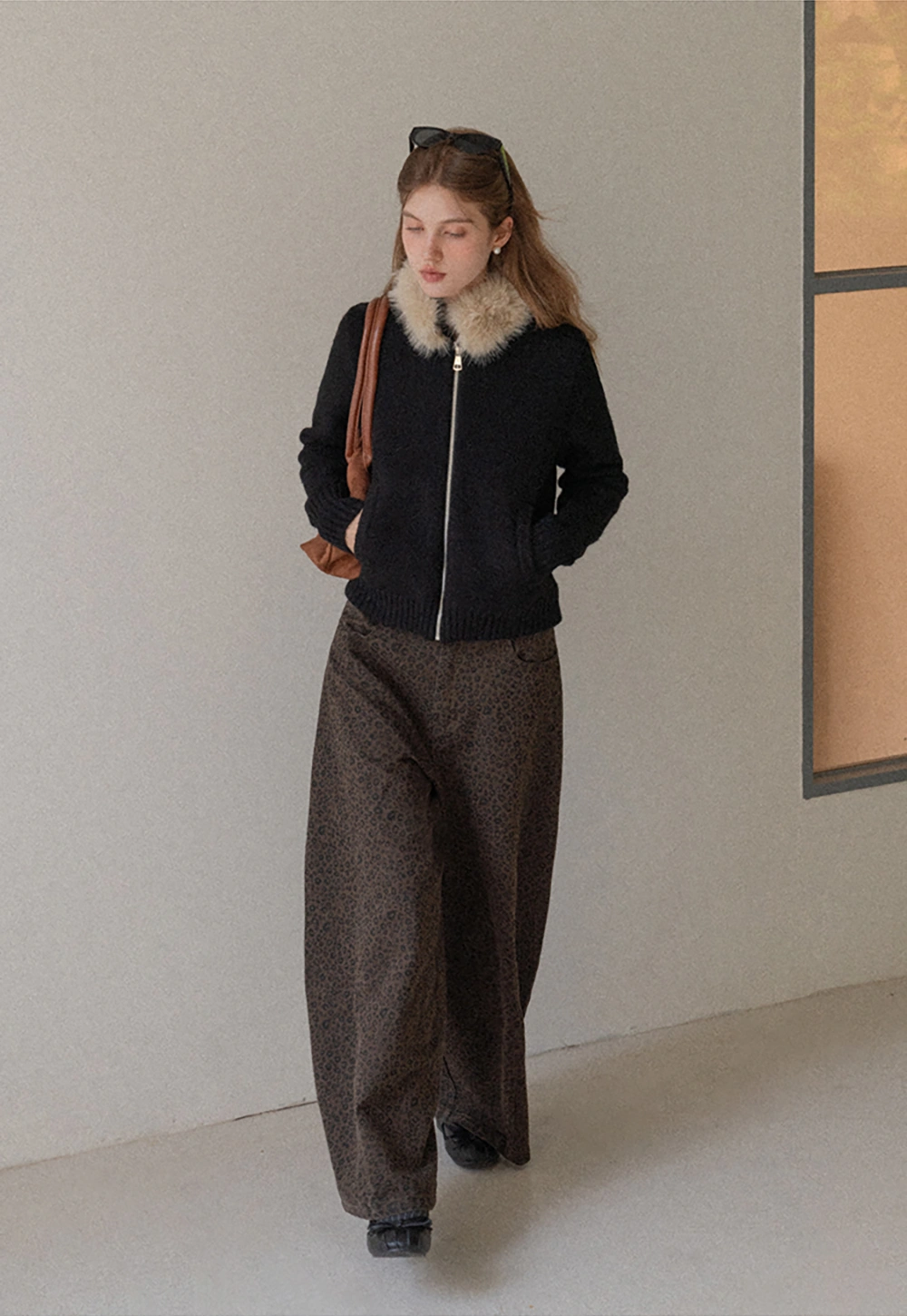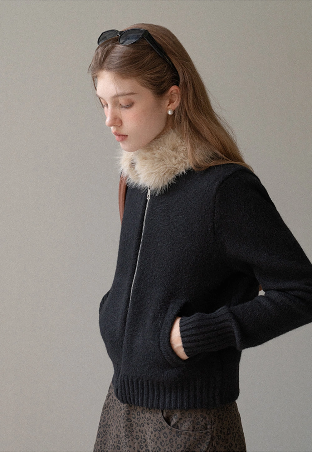 Women Faux Fur Collar Zip Up Short Jacket