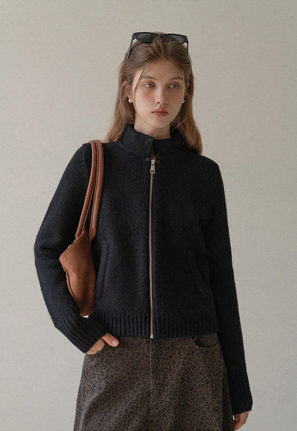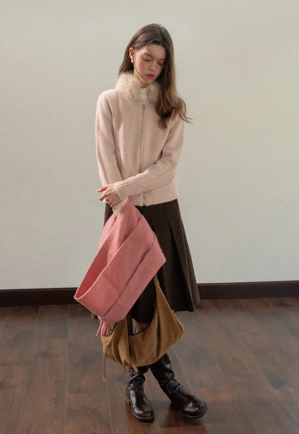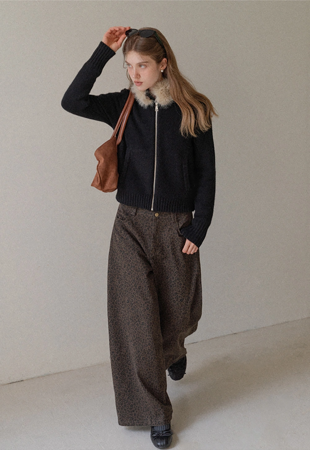 Women Faux Fur Collar Zip Up Short Jacket